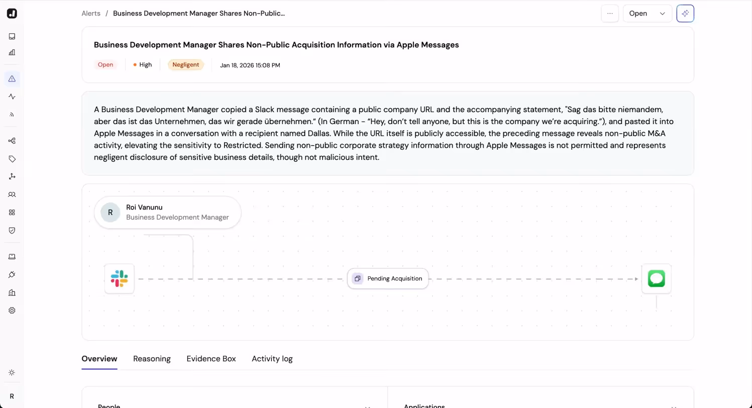 A public URL, a Slack thread, and one message to a former employee—how contextual analysis revealed a pre-IPO acquisition leak traditional tools missed.